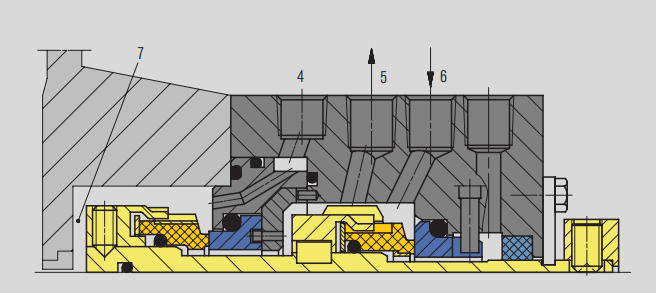 • ஃப்ளஷிங் திரவத்தின் ஓட்டத்தை மெக்கானிக்கல் சீலுக்கு வரம்பிட ஓட்டக் கட்டுப்பாட்டு துளைகளைப் பயன்படுத்துகிறது.