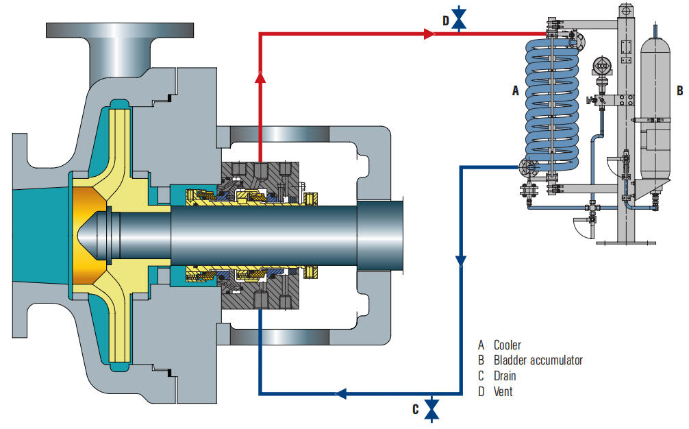திட்டம் 1 க்கு வெளிப்புற பைப்லைன்கள் எதுவும் தேவையில்லை. இது இயந்திர முத்திரைகளுக்கான உள் ஃப்ளஷிங் பைப்லைனாக செயல்படுகிறது. திட்டம் 11 போலல்லாமல், ஃப்ளஷிங் பைப்லைன் வளிமண்டலத்திற்கு வெளிப்படுவதில்லை, இதனால் அதிக பாகுத்தன்மை திரவங்கள் குறைந்த வெப்பநிலையில் உறைதல்/பாலிமரைசிங் செய்வதைத் தடுக்கிறது.