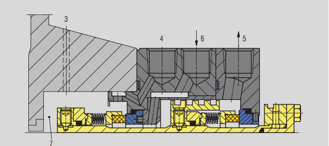 • தடுப்பு திரவமானது உள் முத்திரை முகத்தின் வழியாக செயல்முறை ஊடகத்திற்குள் நுழைகிறது.
