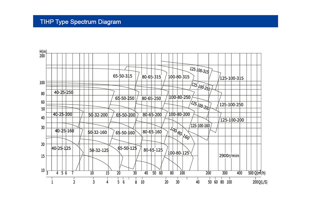 கீழ்-வலது மூலையில் உள்ள "2900 ஆர்/நிமிடம்" என்ற குறியீடு இந்த ஸ்பெக்ட்ரமில் உள்ள விசையியக்கக் குழாய்களின் மதிப்பிடப்பட்ட வேகத்தைக் குறிக்கிறது (மோட்டார் உந்துதல் விசையியக்கக் குழாய்களுக்கான நிலையான வேகம்). வெவ்வேறு வேகங்களுக்கு (எ.கா., 1450 ஆர்/நிமிடம்), செயல்திறனை மாற்ற ஒற்றுமை சட்டத்தைப் பயன்படுத்தவும்: